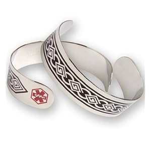 Medical Id Bracelet with style!! Excellent alternative to those who demand Discreet protection. This is a unisex stainless steel cuff bracelet with Tribal design. Medical Symbol is On both ends of the cuff. The cuff is 3/4" wide. This bracelet is a one size fits all, but best fits wrists 7"-9". Diabetes is engraved on the inside.